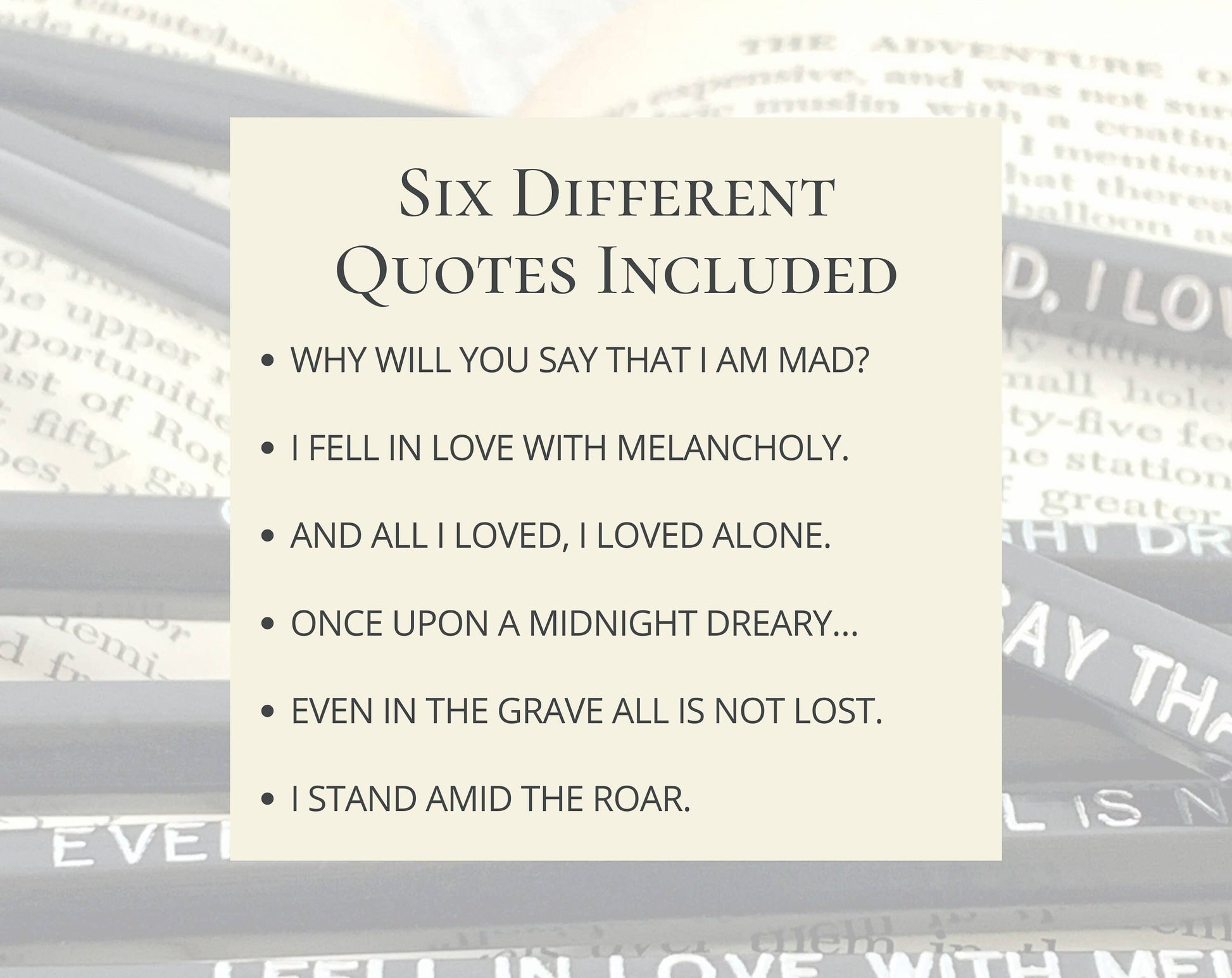 Edgar Allan Poe, renowned for his gothic tales and melancholy poetry, is celebrated in this collection of six quote pencils.