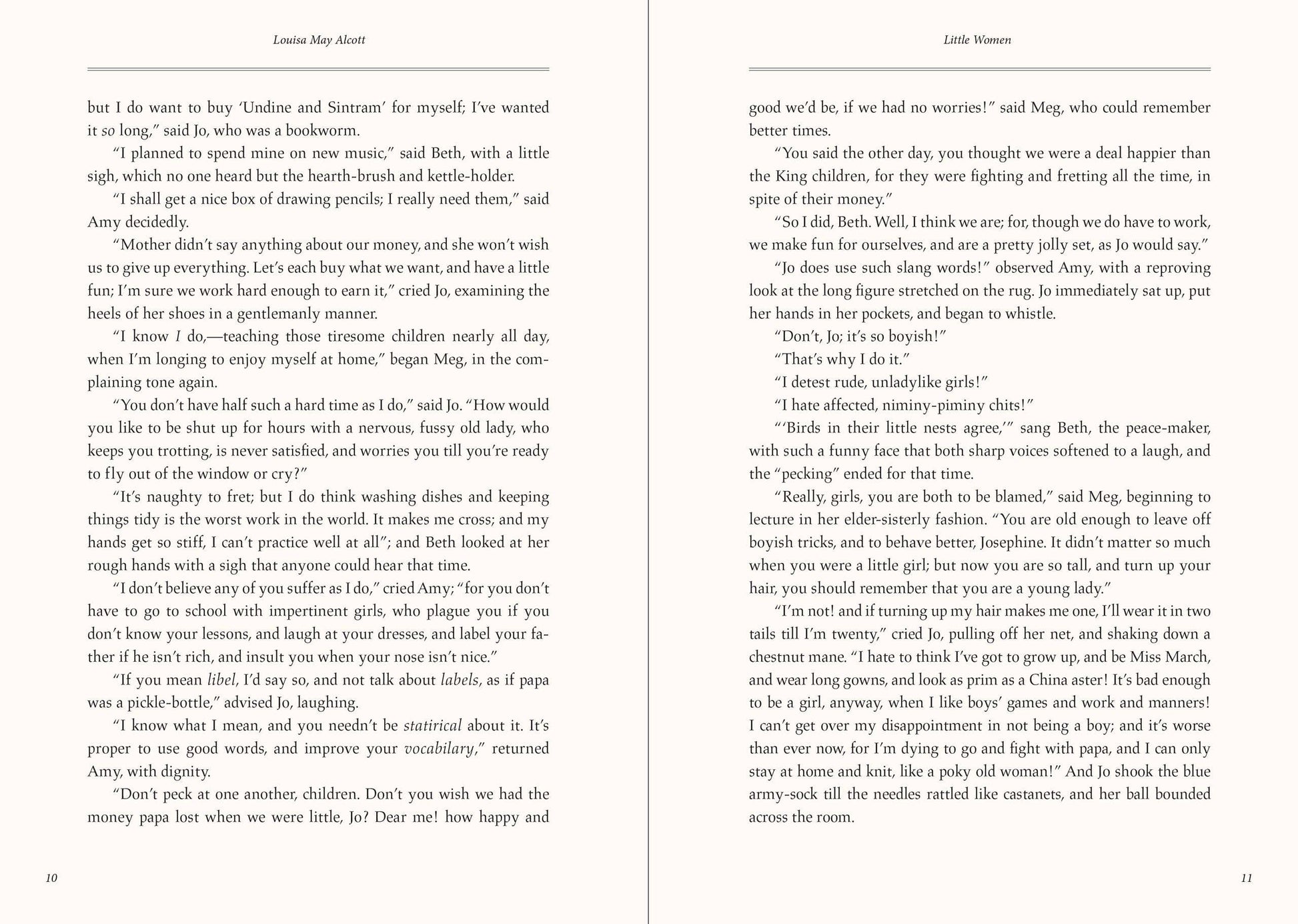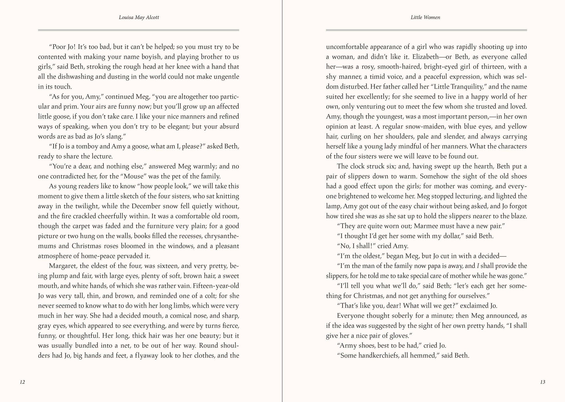 In Little Women; or Meg, Jo, Beth, and Amy, four sisters learn of love, identity, sacrifice, and generosity in a coming-of-age story cherished by generations of readers. • Rediscover this beloved classic in this elegant yet affordable Masterpiece Library Edition, honoring the Peter Pauper Press founders' tradition of publishing beautiful books. • Deluxe, durably bound hardcover keepsake volume. • Embossed cover with iridescent highlighting. • Gold foil-stamped spine. • Reinforced cloth quarter-binding for durability • Premium acid-free archival-quality paper for longevity. • Cream-color pages with font, type size, and line spacing chosen for a comfortable, luxurious reading experience, even under imperfect lighting. • Comes with a matching satin ribbon bookmark with which to keep your place. • A must-have for every home library. • 554 pages. American writer Louisa May Alcott (1832-1888) based her fictional March family